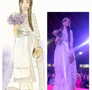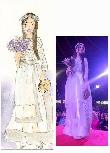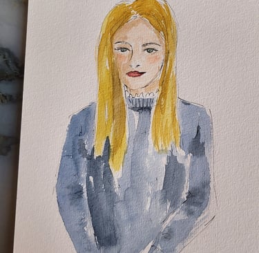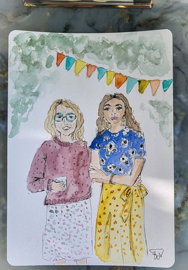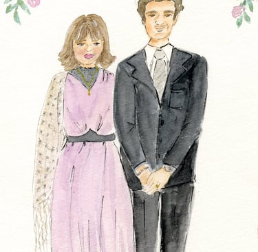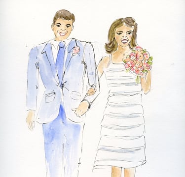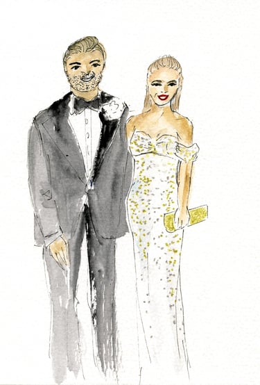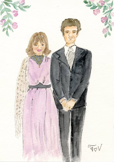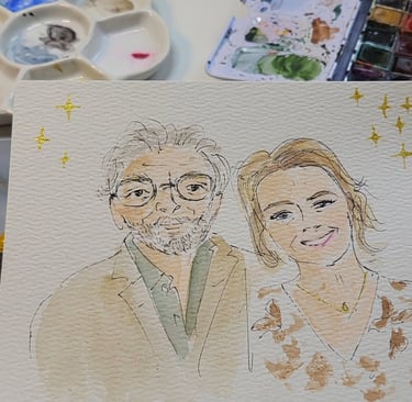 Le live sketching, c’est l’art de croquer des scènes en temps réel, directement sur le lieu de l’événement. Je viens avec tout mon matériel, j’installe un joli stand à croquis. Je prends les invités en photo et ils retournent profiter de leur soirée pendant que je peins leurs portraits stylisés. Chaque dessin est fait main, à l’encre et à l’aquarelle, et autres médiums. J'aime rajouter des paillettes, de l'encre métallisée, etc...selon l'inspiration du moment.