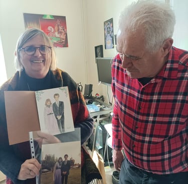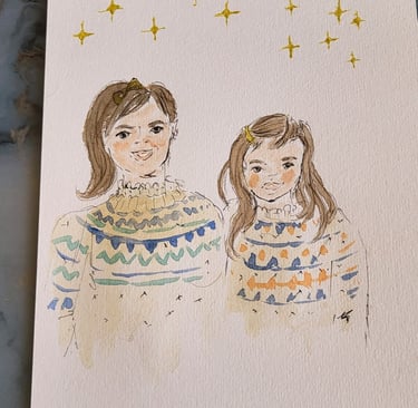 En parallèle du live sketching, je réalise aussi des croquis stylisés sur commande ou des portraits de famille créés à partir de photos anciennes.