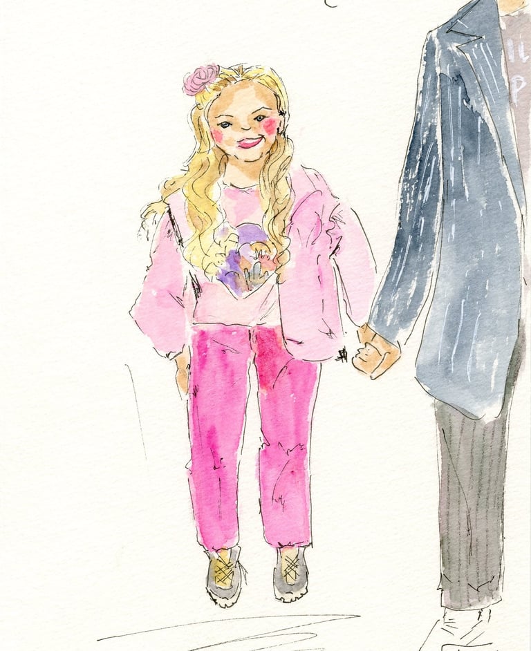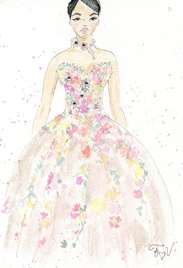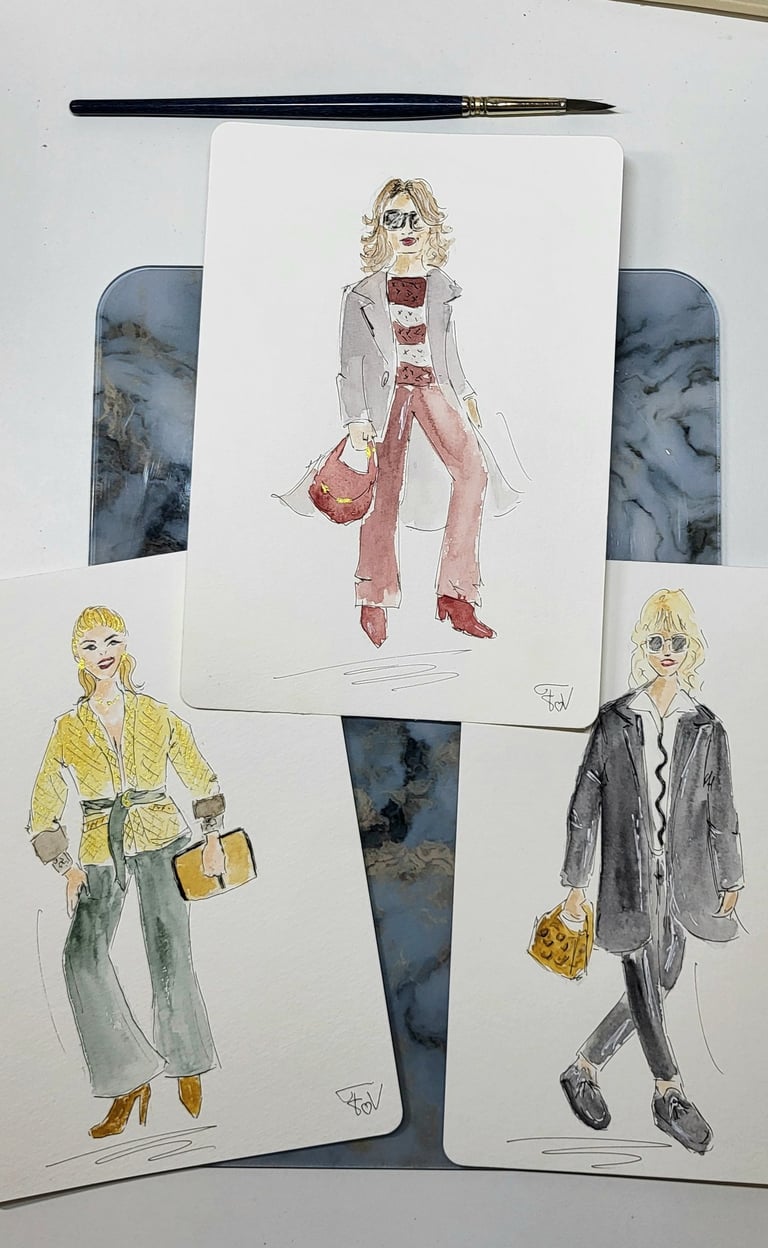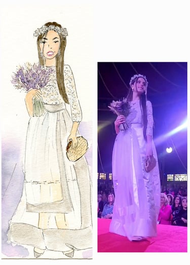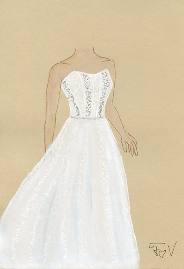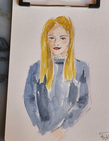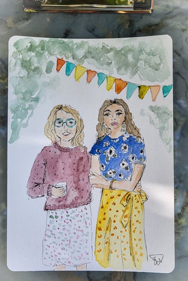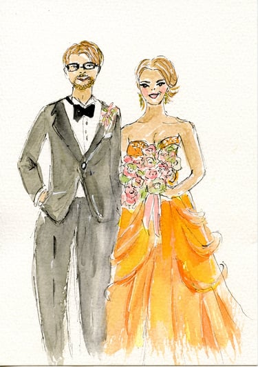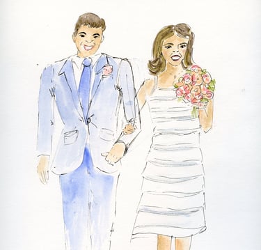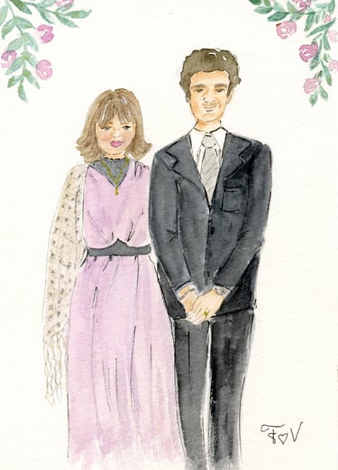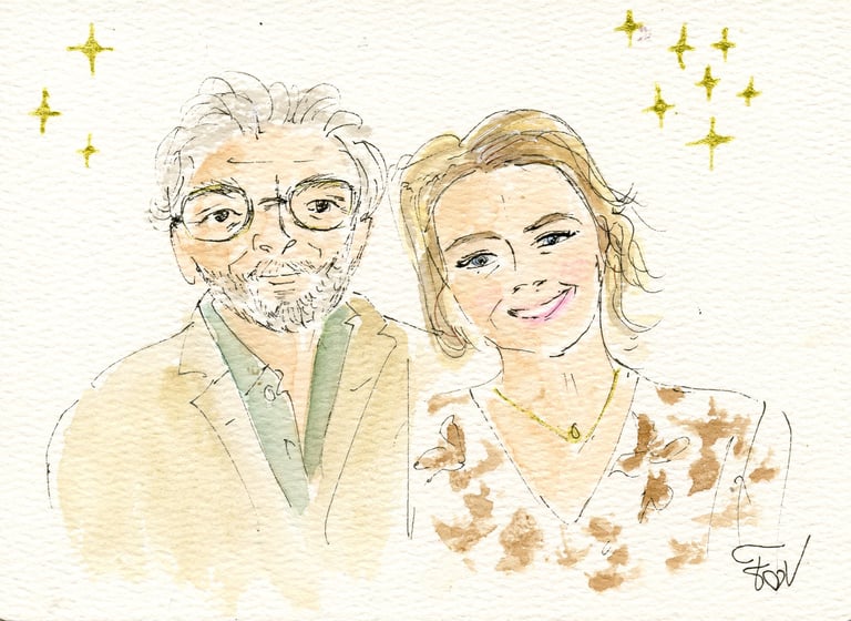 Le live sketching, c’est l’art de croquer des scènes en temps réel, directement sur le lieu de l’événement. Je viens avec tout mon matériel, j’installe un joli stand à croquis. Je prends les invités en photo et ils retournent profiter de leur soirée pendant que je peins leurs portraits stylisés. Chaque dessin est fait main, à l’encre et à l’aquarelle, et autres médiums. J'aime rajouter des paillettes, de l'encre métallisée, etc...selon l'inspiration du moment.