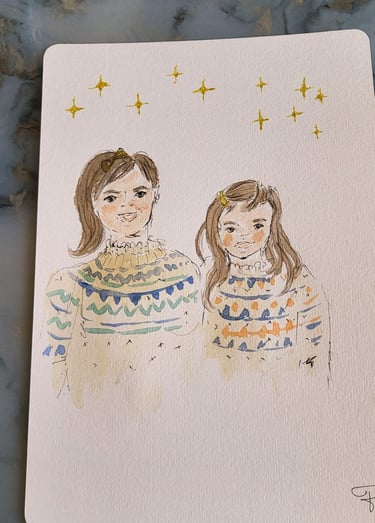 Je peux vous faire une illustration à l’encre et à l’aquarelle d’après vos photos préférées, vous pouvez inclure aussi votre animal favori, pourquoi pas!